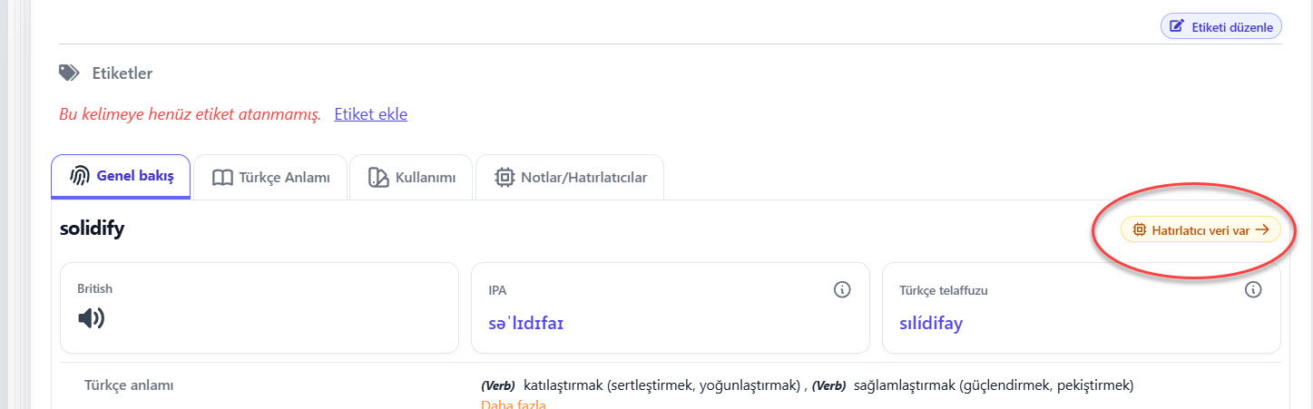 If the word you find is already in your notebook, you'll see an Edit button. If not, save it by pressing the Save button. After you save it, the button will change to Edit. By clicking this button, you can add notes to the word in your notebook and associate tags you've created in the tag section.