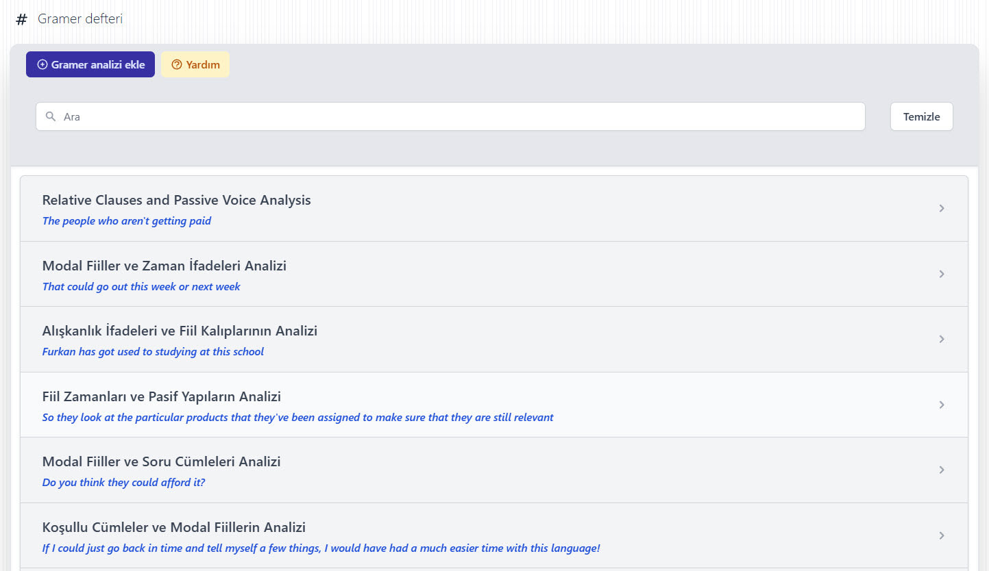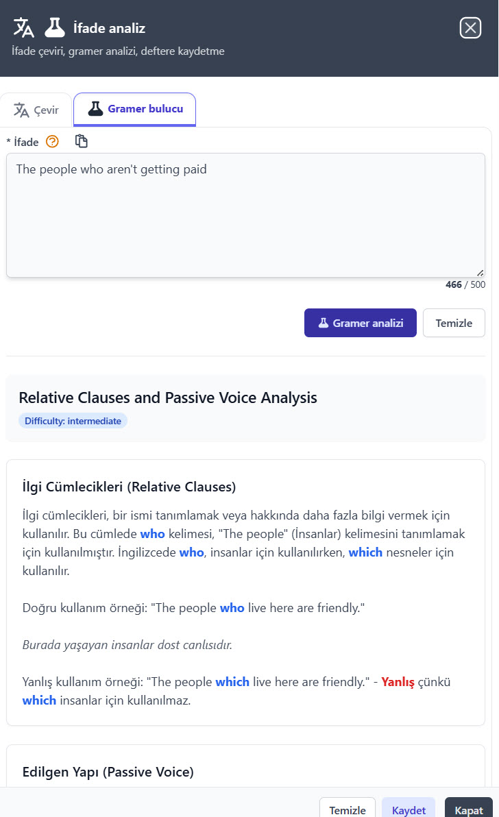 It identifies the grammar topics in the sentence you provide and explains them with examples in your native language. If you wish, you can save the sentence to your grammar notebook and review it again in the future, or use it as a reference.