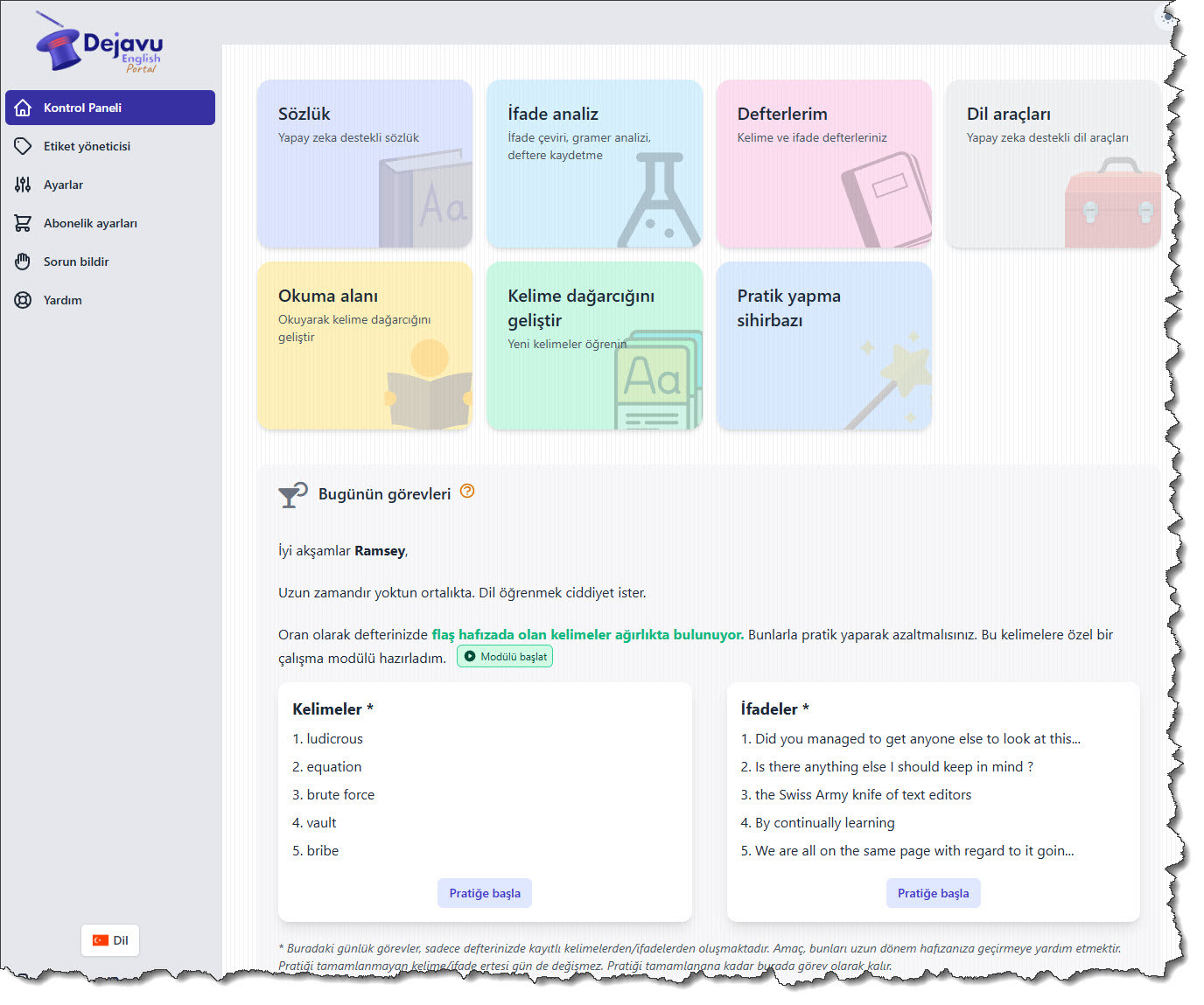 Dejavu size hatırlatma yaptıktan sonra pratik yapmanız için size özel hazırlanan görevlerle pratik yaptırarak defterinizdeki bu kelime ve ifadeleri kalıcı hafızanıza geçirmenize yardım eder.