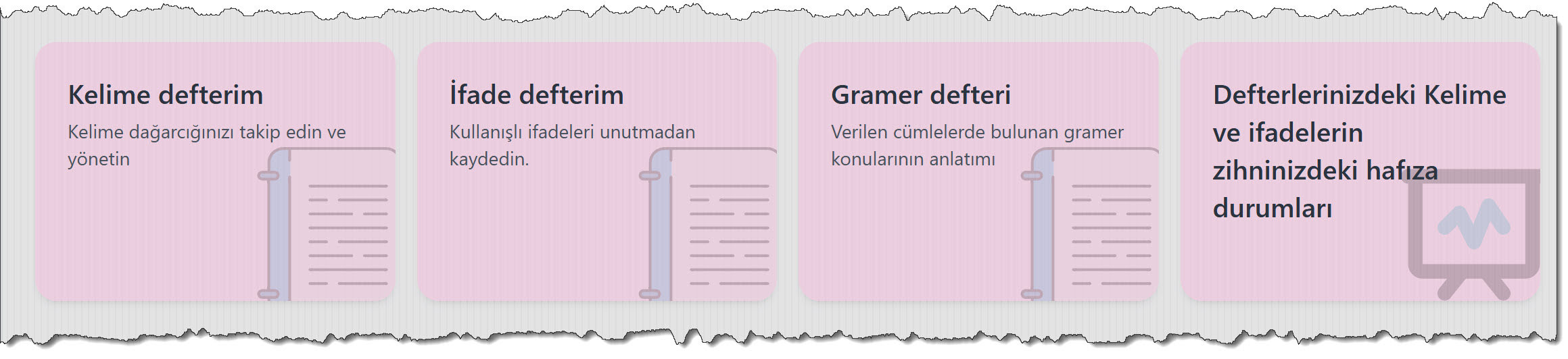 Günlük hayatta karşılaştığınız yeni kelime ve ifadeleri içerisinde bulunan dijital defterlerinize kaydedebilirsiniz. Böylece öğrendiğiniz her şeyi güvenli bir yerde muhafaza etmiş olacaksınız. Tüm bu kaydettiğiniz girdiler, okuduğunuz İngilizce metinlerde yer alıyorsa, hafıza durumlarına göre metin içerisinde hafıza renk kodlarıyla renklendirilecektir. Kısaca metni okurken size dejavu etkisi yaşatacaktır.
