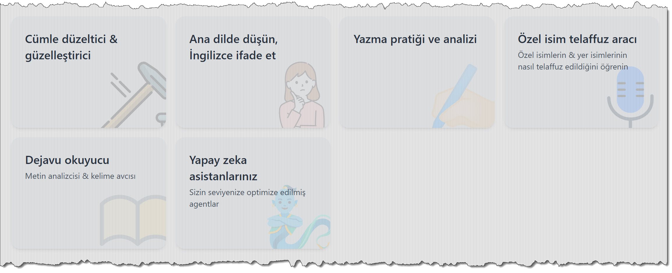 Dejavu English’i bir "portal" olarak tanımlamamızın nedeni, İngilizce dil öğrenme yolculuğunuzda ihtiyacınız olan tüm araçları tek bir platformda bir araya getirmesidir. Bu araçlar arasındaki mükemmel uyum ve entegrasyon ile size kelime dağarcığınızı hızla geliştirme olanağı sağlar.
