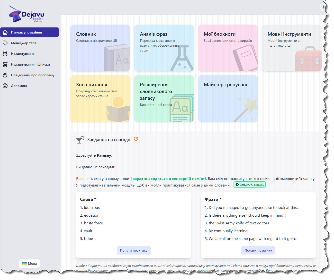 Як свідчить його девіз, цей портал є вашим швейцарським армійським ножем для вивчення англійської мови. Це тому, що всі інструменти, які вам потрібні у вашій подорожі вивчення англійської мови, зібрані на одній платформі. Між усіма інструментами існує ідеальна гармонія та зв'язок. Використовуючи портал Dejavu English, ви максимально підвищите свою ефективність у вивченні мови та розвитку словникового запасу.